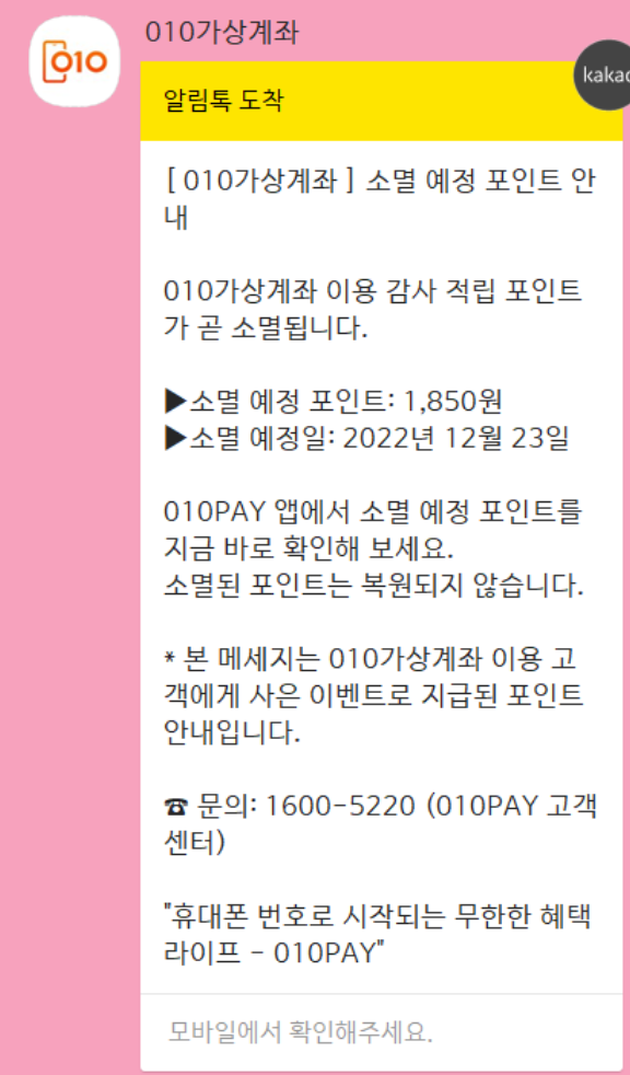 일일이 확인하지 않아도 카카오톡으로 약 2주 전에 소멸예정 알림이 옵니다!