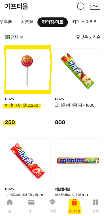보통은 금액대가 맞지 않아서 소액일 경우 포인트를 못쓰는 경우가 많으셨을 건데, 제가 확인했던 제일 저렴이는 편의점에서 츄파춥스를 무려 "250" 포인트로 구매할 수 있었습니다. 초대코드로 가입하면, 추가 1,000포인트를 주니까 꼭 등록해서 가입하세요~